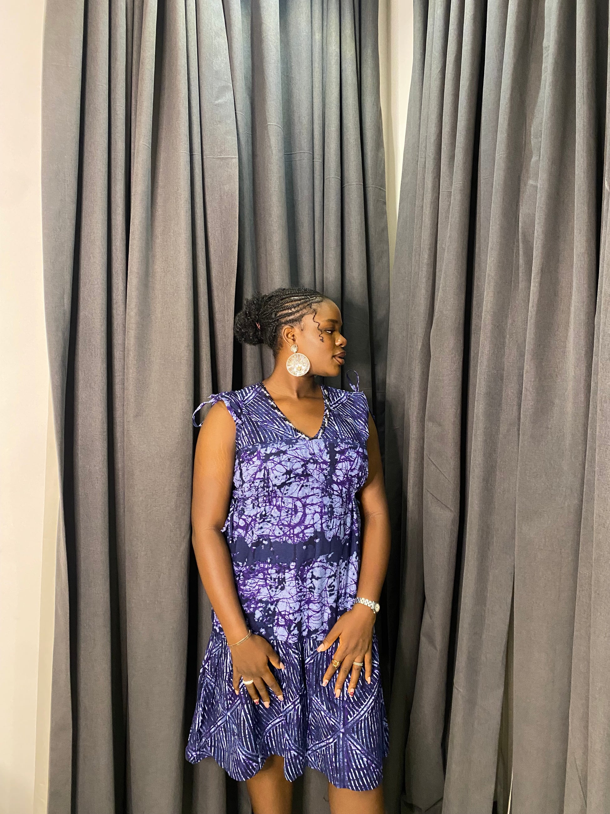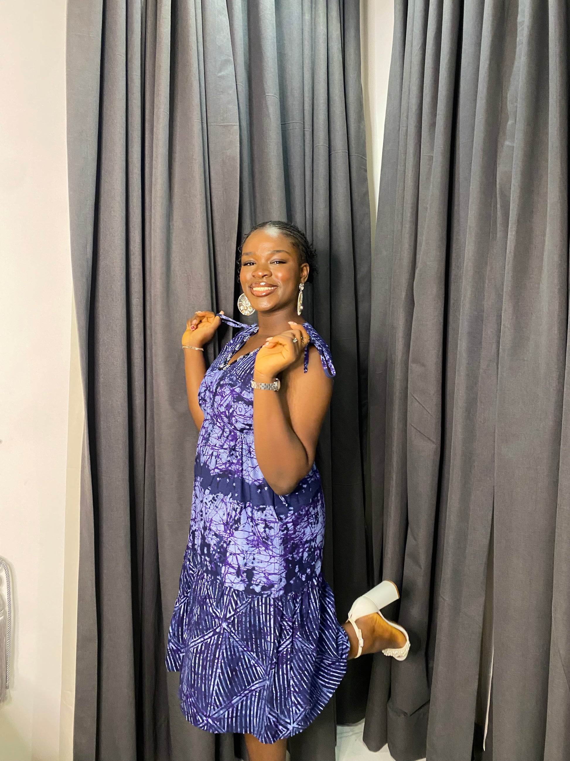 Inspired by twilight, the Viola Sky Dress is crafted from premium Ankara with a dreamy floral print, hand-beaded neckline, and tie-shoulder straps for an adjustable fit. Soft yet structured, it features deep side pockets for ease.